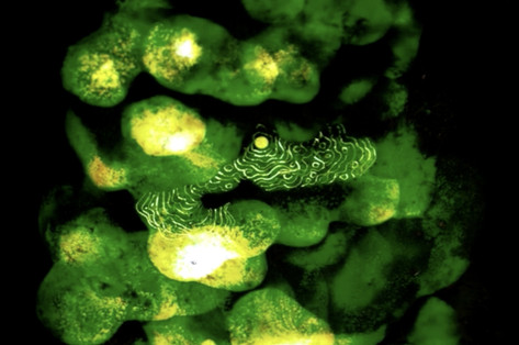 앞서 보았던 거미에게 찔린 안구에 퍼지는 독 이미지는 검정 스폰지 위에 키보드 먼지 제거 스프레이를 뿌려서 만들어냈다. 스프레이를 거꾸로 들어서 사용하면 매우 차가운 바람이 나와서 잠시 얇게 얼어버린다. 그것이 녹는 과정을 촬영했다.